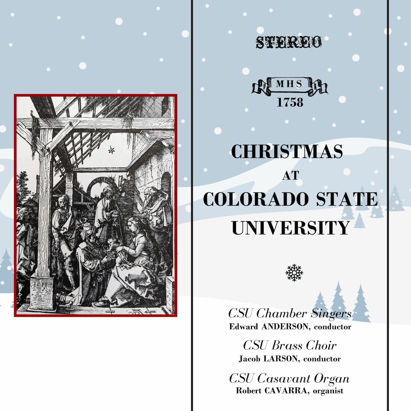 Some of the richest and most beloved heritage we enjoy from our Western Civilization are the miniature musical gems produced by composers of all ages from the Season of Christmas. Cherished by every musician and music lover, this great literature has brought joy, peace, and promise to the heart of man for countless centuries. Inspired by the profound human emotions which were sparked by the Divine Hope of the birth of the Christ-child, composers of every century have been moved to unique heights of creativity in their production of music for this special Season. At the core of this great body of music, indeed, some of its most delicate and carefully wrought works, are those composed for organ and choir. It is our desire here to present a few of these works, as interpreted by Colorado State University's Chamber Singers, the CSỦ Brass Choir, and played upon University's glorious Casavant Organ.